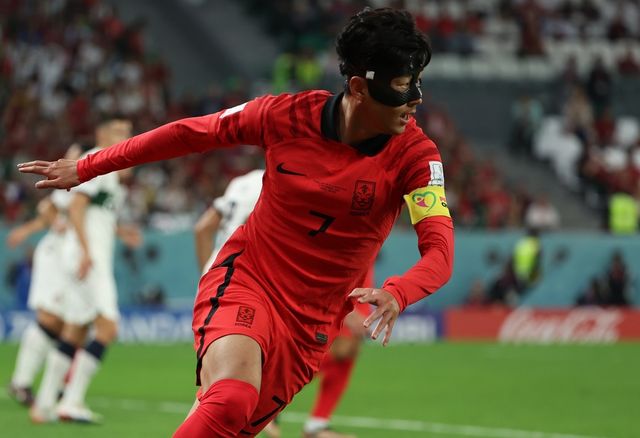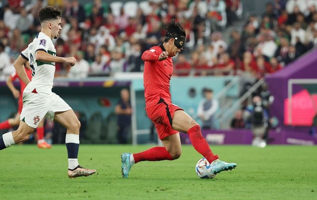 손흥민이 지난해 12월 3일(한국 시각) 카타르 알라이얀의 에듀케이션 시티 스타디움에서 열린 2022 카타르 월드컵 조별리그 H조 3차전 대한민국과 포르투갈 경기에서 안면 보호대를 착용한 채 공격에 가담하고 있다. / 연합뉴스