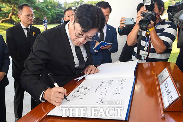 홍익표 더불어민주당 원내대표가 4일 오전 서울 동작구 국립서울 현충원을 찾아 헌충탑에서 참배를 마친뒤 방명록을 작성하고 있다. /장윤석 인턴기자