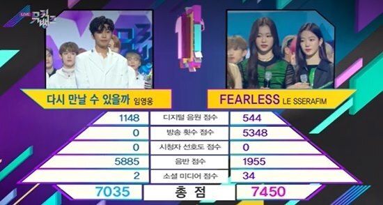 그런데 4대 음악방송 프로그램 중 KBS 2TV '뮤직뱅크'가 빠져 있어 의아함을 샀다. 임영웅은 지난해 5월 '다시 만날 수 있을까'로 걸그룹 르세라핌과 1위 후보에 올랐다. 임영웅의 음반점수는 5885점, 디지털 음원점수는 1148점으로 르세라핌을 크게 앞섰다. 하지만 방송횟수 점수에서 임영웅이 0점을 획득해 방송점수 5348점을 기록한 르세라핌에 밀린 것.
