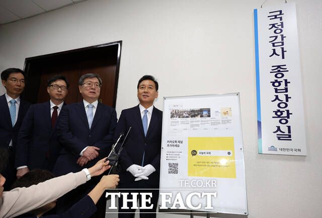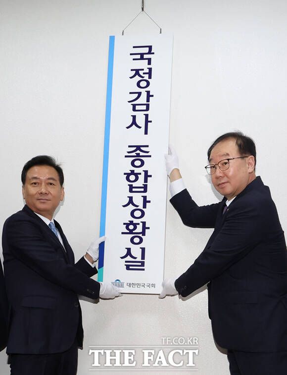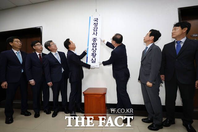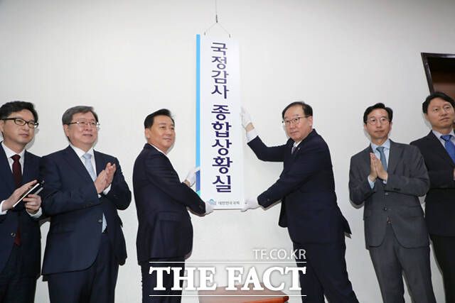 [더팩트ㅣ국회=이새롬 기자] 이광재(왼쪽 세번째) 국회사무총장과 권영진(왼쪽 네번째) 입법차장 등 사무처 관계자들이 4일 서울 여의도 국회 의사과 앞에서 열린 국정감사 종합상황실 현판식에서 현판을 걸고 있다.