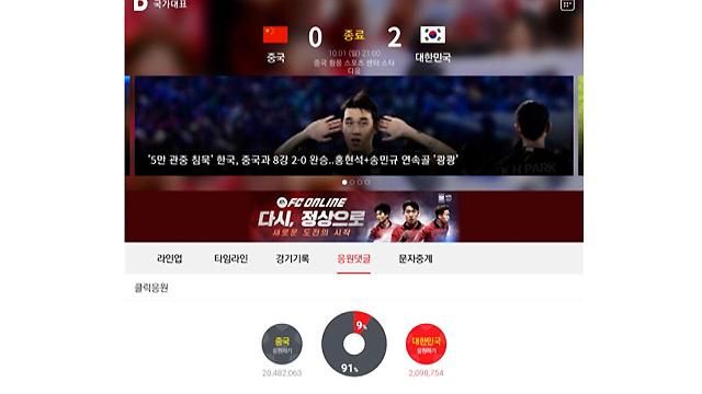 杭州亚运会男足八强入围赛中韩对决当时DAUM网站实时应援情况【图片提供 DAUM网站截图】