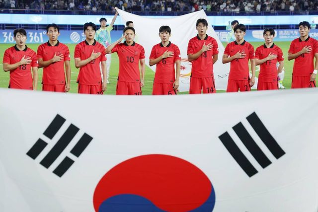 지난 4일 오후 중국 항저우 황룽 스포츠센터 스타디움에서 열린 2022 항저우 아시안게임 남자 축구 대한민국과 우즈베키스탄의 4강전 시작에 앞서 대한민국 선수들이 애국가를 제창하고 있다. / 뉴스1