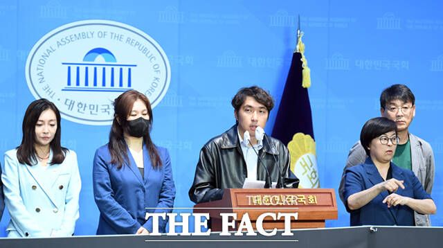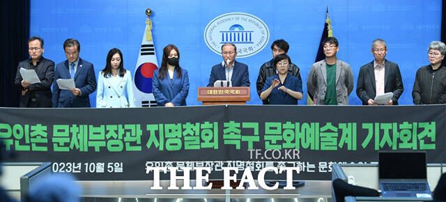 유인촌 문화체육관광부 장관 후보자의 인사청문회를 앞둔 5일 서울 여의도 국회 소통관에서 유인촌 장관 지명 철회 문화예술인 공동행동 회원들이 기자회견을 하고 있다.