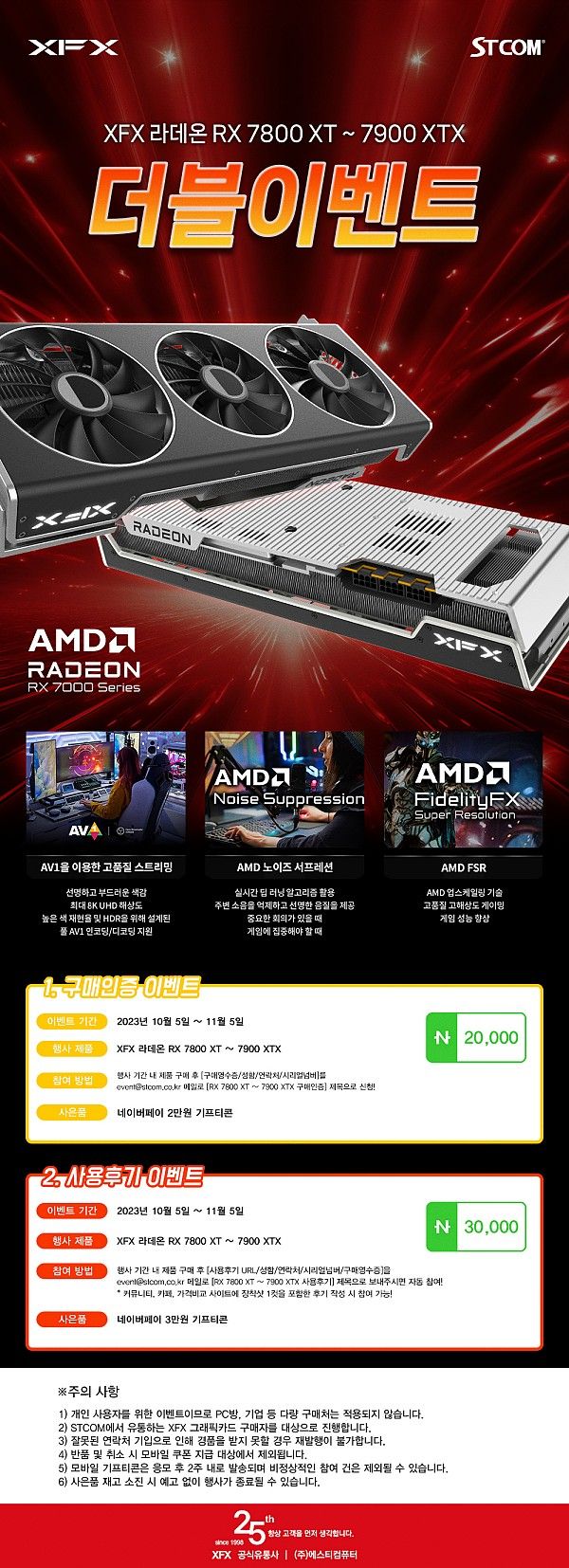 더블 이벤트는 XFX 라데온 RX 7800 XT ~ RX 7900 XTX 시리즈를 대상으로 진행한다. 기간은 2023년 10월 5일부터 11월 5일까지 제품 구매 인증 시 네이버 페이 기프티콘 2만원 권이 지급된다. 또한 제품 장착 사진 1컷 이상을 포함한 구매 후기 인증 시 네이버 페이 기프티콘 3만원 권이 추가로 제공된다.
