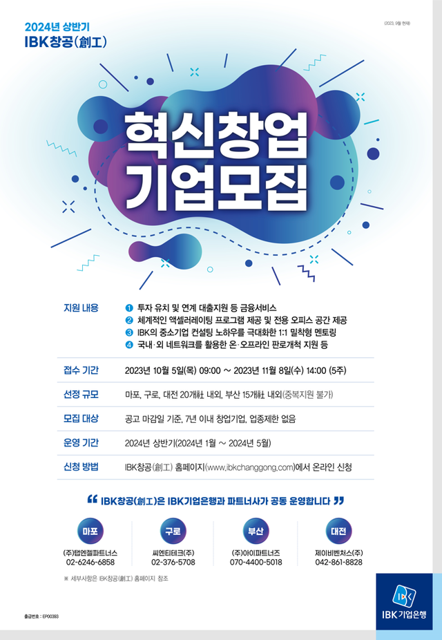 모집 기간은 11월 8일 14시까지로 5주간 모집 예정이며 12월 하순 최종 선발기업을 발표한다. 지원신청과 자세한 공고내용 확인은 IBK창공 홈페이지에서 가능하다.