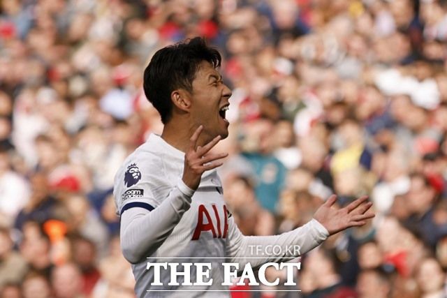 토트넘의 '뉴 캡틴' 손흥민은 7일 오후 8시 30분 루턴 타운과 EPL 8라운드 원정경기에서 시즌 7호골에 도전한다. 사진은 지난달 24일 아스널과 2023~2024 EPL 6라운드 원정경기에서 1-2로 뒤지던 후반 동점골을 터뜨린 뒤 포효하는 장면./런던=AP.뉴시스