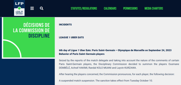 6일(한국시간) 프랑스 프로축구연맹은 공식 홈페이지를 통해 “징계위원회는 PSG 선수 우스만 뎀벨레, 아슈라프 하키미, 랑달 콜로 무아니, 레뱅 퀴르자와를 소환했다. 그들의 의견을 들은 뒤 네 선수에게 1경기 출장 정지 징계를 내리기로 결정했다. 이는 10월 10일부터 유효하다”고 발표했다.