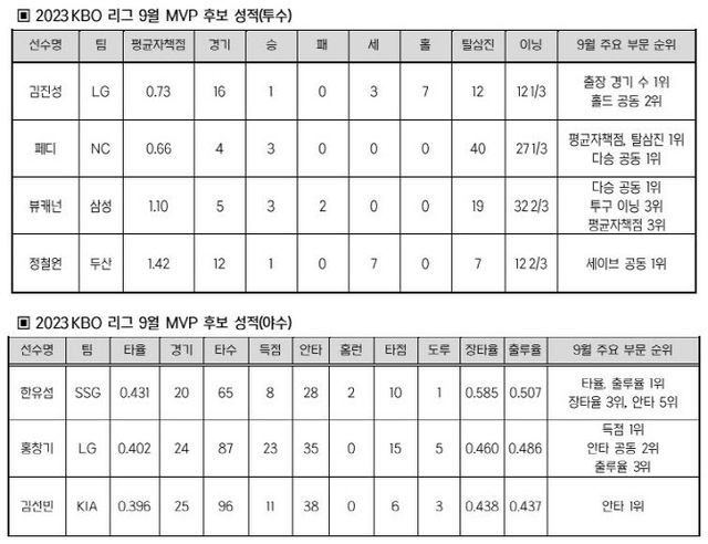 [이데일리 스타in 이석무 기자] 2023 신한은행 SOL KBO 리그 9월 월간 MVP 후보가 빌표됐다. LG 김진성, NC 에릭 페디, 삼성 데이비드 뷰캐넌, 두산 정철원(이상 투수), SSG 한유섬, LG 홍창기, KIA 김선빈(이상 야수)이 후보로 선정돼 9월 MVP를 노린다.