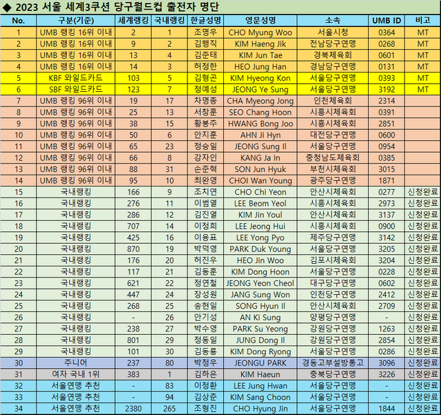 서울 당구월드컵에 출전하는 한국 선수 엔트리는 총 34명. UMB 세계랭킹 톱랭커 시드로 4명, 대한당구연맹 와일드카드 1장, 서울당구연맹 와일드카드 1장 등 총 6명이 본선에 올라갔다.