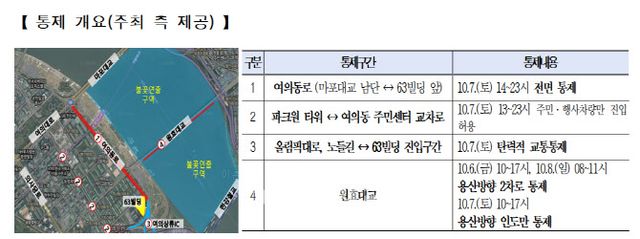 서울시는 이날 오후 2시부터 순찰선 36척을 투입하고, 불꽃축제가 열릴 수상 구간의 민간 보트 통행을 통제한다. 또 한강대교 가운데 위치한 ‘노들섬’은 지난 6일 오후 10시부터 7일 오후 11시까지 하단부 출입을 폐쇄하고, 야외테라스 등 일부 공간 출입이 제한된다. 이날 오후 2~11시 여의동로(마포대교 남단~63빌딩 앞)가 전면 통제돼 버스를 비롯한 모든 차량은 우회해야 한다.