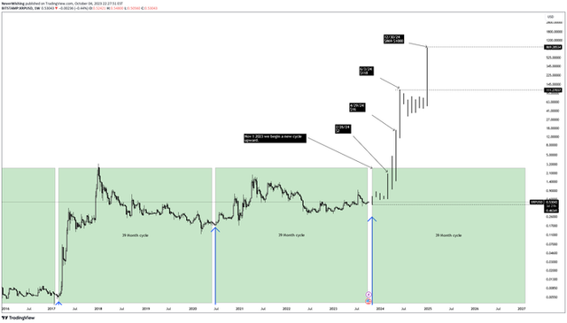 그 이후로 또 다른 39개월 주기가 카운트되기 시작했고, 다시 한 번 일반적으로 급등하는 지점에 도달했다는 설명이다.