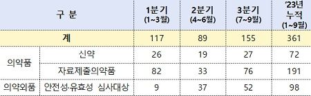 식품의약품안전처(처장 오유경)가 2023년 3분기(7·8·9월) 의약품 103개, 의약외품 52개 총 155개 품목(신규허가 134개, 변경허가 21개)의 허가심사 결과(허가보고서)를 순차적으로 공개했다.