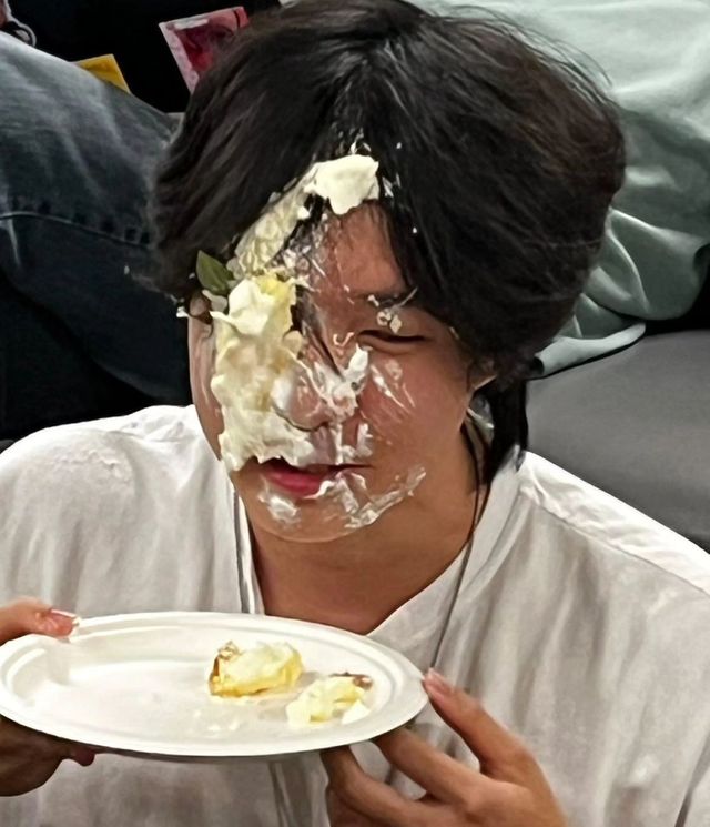 사진 속 김민국은 얼굴에 케이크가 범벅된 채로 생일을 축하받고 있다.