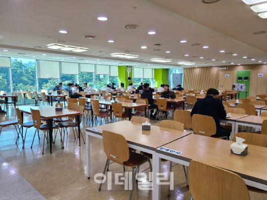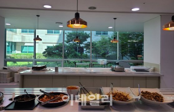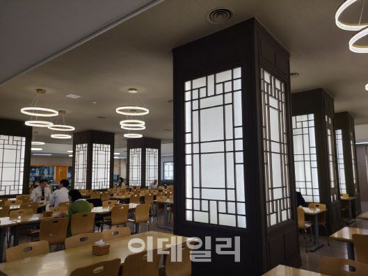 지난 5일 찾은 1식당의 점심 메뉴는 코다리해물찜, 찰흑미밥, 미역국, 아삭이고추양파무침, 구운버섯샐러드. 2식당 메뉴는 서울식 불고기, 순대김말이 강정, 가지볶음, 양배추쌈, 맛살샐러드, 오이미무침. 가격이 두 배가량 비싸서인지 한끼식사칼로리도 달라, 1식당은 보통 800칼로리 수준인데 2식당은 1300칼로리를 웃돈다. 더 든든하려나. 다만 내부 인테리어, 통창 바깥 풍경 등은 유사하다.