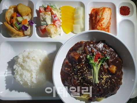 지난 6일 찾은 이 식당의 점심 메뉴는 자장면과 밥, 모둠 탕수육, 과일샐러드, 단무지와 김치. 메인 메뉴는 조리사에게 정량을 배식 받고 다른 반찬과 밥 등은 양껏 먹을 수 있다. 물론 메인 메뉴도 더 달라고 하면 더 주기 때문에 몇몇 이들의 식판엔 고봉이 솟아 있다. 이 식당에선 아침, 점심, 저녁을 모두 해결할 수 있다. 아침은 누룽지와 미역국, 국밥처럼 속 편한 메뉴들이 주를 이룬다.