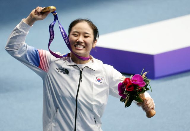 안세영은 7일 중국 항저우 빈장체육관에서 열린 배드민턴 여자 단식 결승에서 세계 3위 천위페이(중국)를 2-1(21-18 17-21 21-8)로 꺾고 시상대 가장 높은 곳에 섰다.
