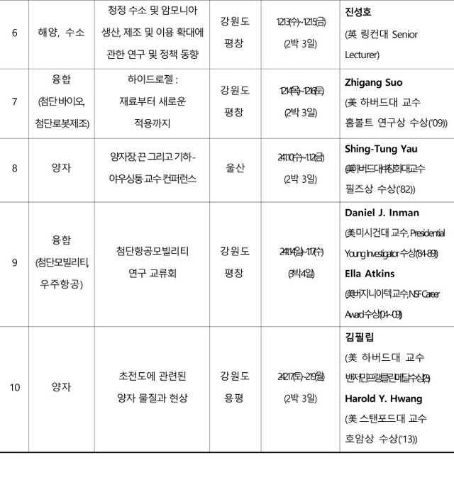 주요 연사로는 필즈상 수상자인 싱퉁야우(Shing-Tung Yau) 미 하버드대 교수, 김필립 미 하버드대 교수, 황윤성(Harold Y. Hwang) 미 스탠퍼드대 교수, 지강수오(Zhigang Suo) 미 하버드대 교수 등이 참여한다.