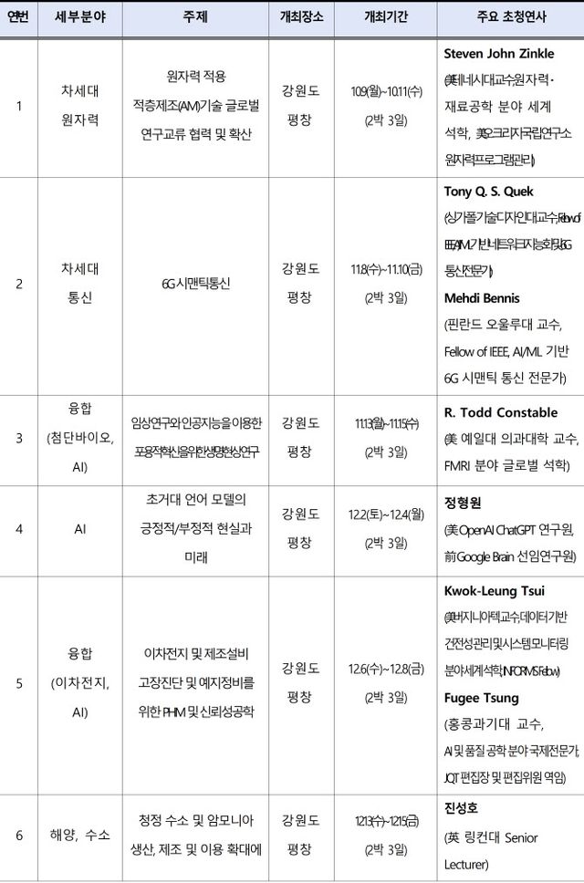 올해에도 세계 각국의 석학을 포함한 300여 명의 국내외 연구자가 참여할 예정이며, 10월 9일부터 시작하여 12대 국가전략기술 분야 중심의 기술 교류회가 강원도와 울산에서 10회에 걸쳐 개최될 예정이다.