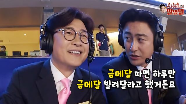 안정환은 “제가 황선홍 감독님한테 금메달 따면 하루만 금메달 빌려달라고 했다. 제가 하루 동안 차고 다니려고”라며 “그 꿈이 이루어졌다”고 너스레를 떨었다. 옆에서 듣고 있던 서형욱 해설위완과 김성주 캐스터는 참았던 웃음을 터뜨렸다.