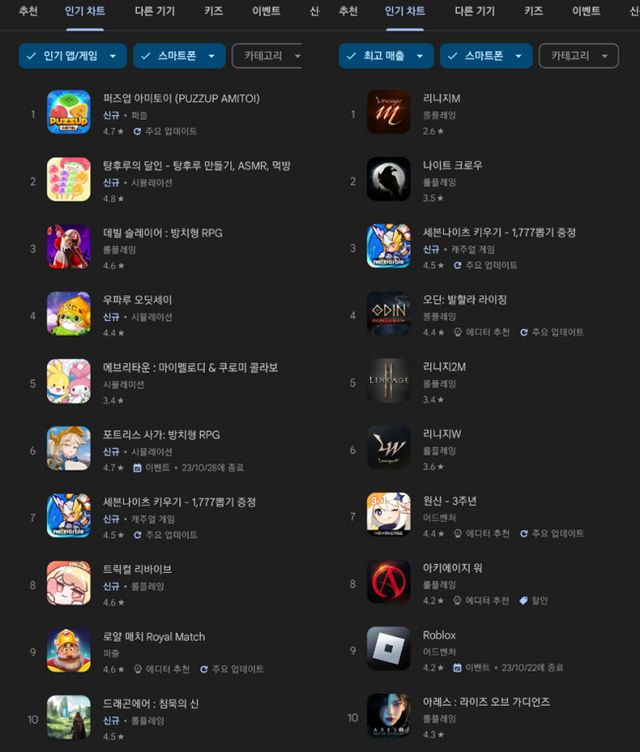 2023년 10월 1째주(2023년 10월 2일 ~ 2023년 10월 8일) 어떤 게임들이 유저들의 선택과 주목할 만한 신작 혹은 업데이트는 무엇이 있는지 살펴보자.