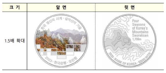 [이데일리 최정희 기자] 한국은행은 사계절 특색이 뚜렷한 우리나라 명산의 아름다움을 국내외에 널리 알리기 위해 ‘한국 명산의 사계’ 기념주화 4종을 발행할 예정이라고 9일 밝혔다.