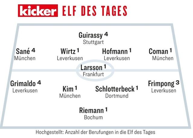 김민재와 슐로터베크 외엔 정우영 소속팀인 슈투트가르트의 기니 공격수 세르후 귀라시가 원톱으로 뽑혔으며, 중원엔 김민재 동료인 자네와 코망을 비롯해 요나스 호프만, 플로리안 뷔르츠(이상 바이엘 레버쿠젠)이 포함됐다. 수비형 미드필더 한 명은 프랑크푸르트에서 뛰는 후고 라르손에게 돌아갔다.