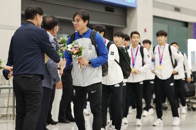 2022 항저우 아시안게임에서 금메달을 따내 3연패 위업을 달성한 남자 축구대표팀 황선홍 감독과 선수들이 8일 오후 인천공항을 통해 귀국하고 있다. / 뉴스1
