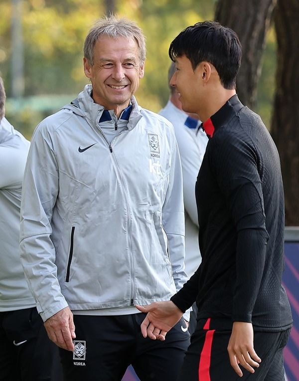 클린스만 감독이 국가대표 주장 손흥민을 바라보며 웃고 있다. / 뉴스1