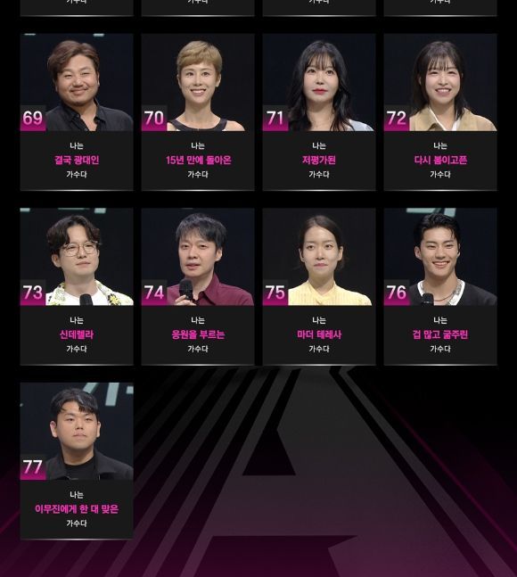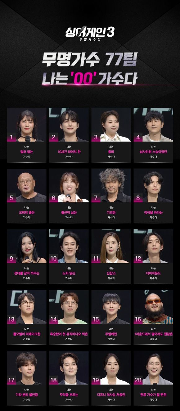 JTBC '싱어게인 시즌3-무명가수전'(이하 '싱어게인3') 측은 본선에 진출한 무명가수 77팀을 먼저 오픈했다.