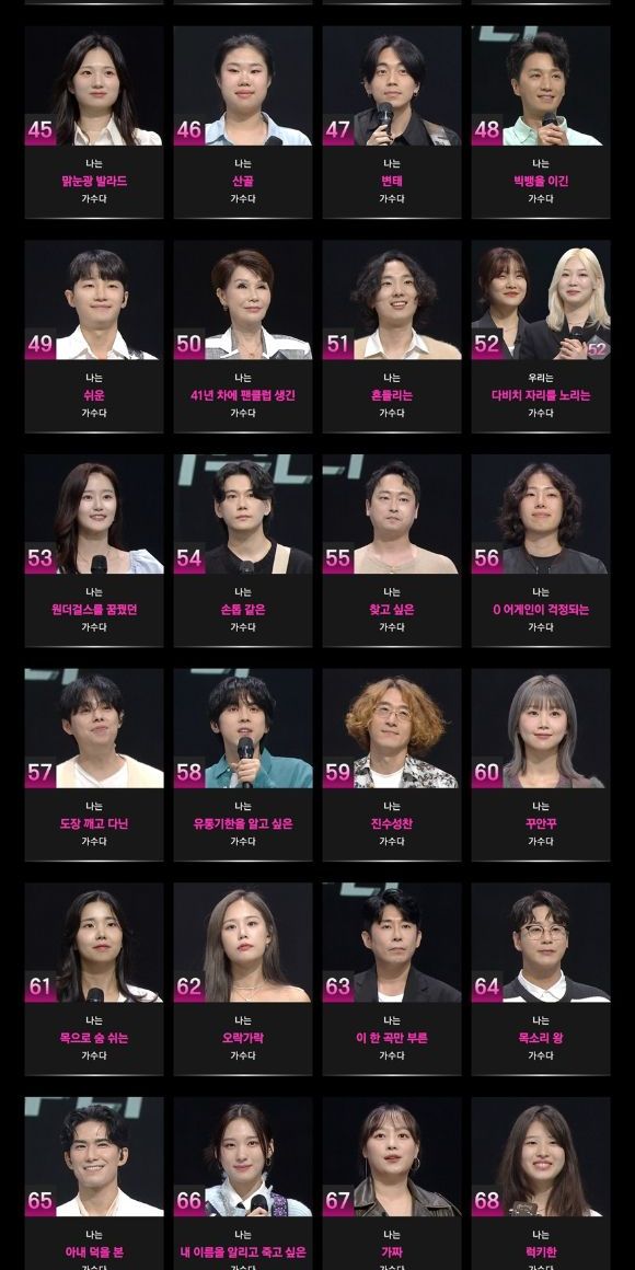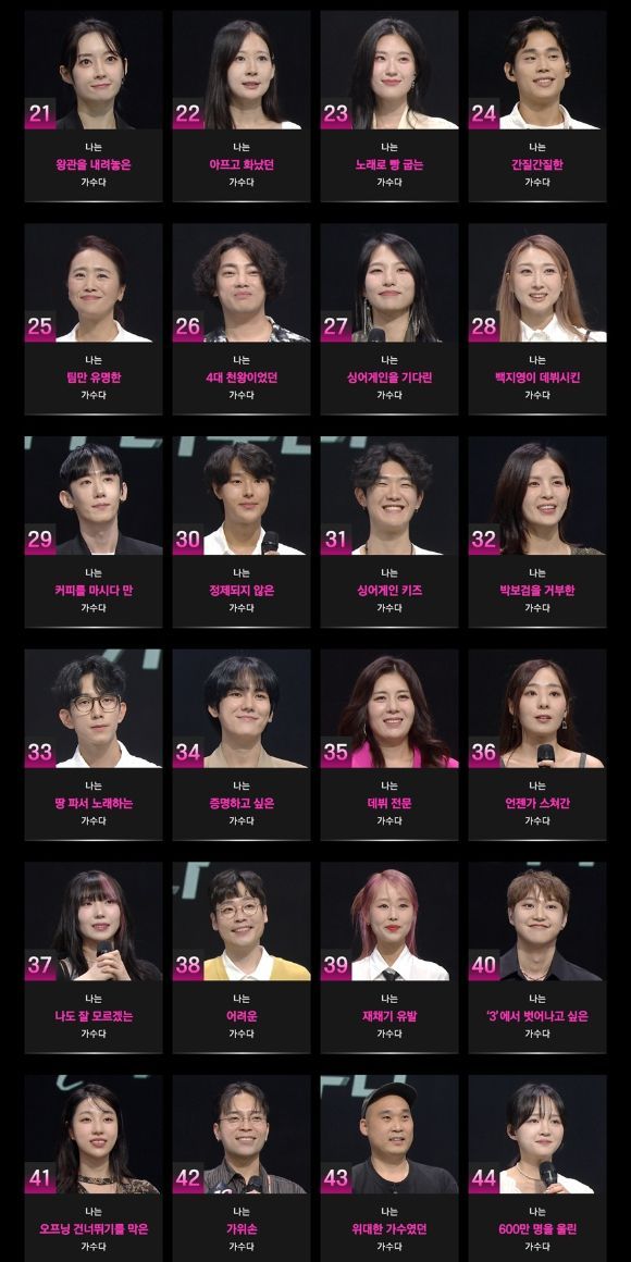 특히 '나는 심사위원 스승이었던 가수다', '나는 백지영이 데뷔시킨 가수다', '우리는 다비치 자리를 노리는 가수다', '나는 원더걸스를 꿈꿨던 가수다'라는 심사위원들과 관련된 소개가 눈길을 끈다. '나는 박보검을 거부한 가수다', '나는 이무진에게 한 대 맞은 가수다' 등 유명한 배우, 가수들과 얽힌 사연이 있는 듯한 소개 역시 궁금증을 자극한다.