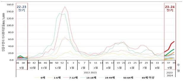 독감 환자는 꾸준히 증가하고 있는데, 연령대별로는 소아를 포함한 학생 연령층을 중심으로 유행 확산이 뚜렷하게 나타난다. 9월 4째 주 기준 7~12세는 53.8명, 13~18세는 31.8명, 1~6새는 22.9명 순으로 높았다.