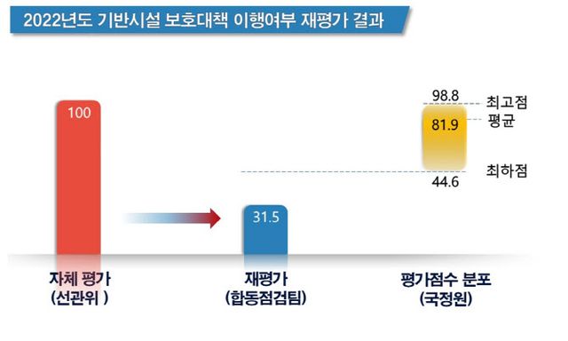지난해 선관위는 ‘주요정보통신기반시설 보호대책 이행여부 점검’ 자체 평가 점수를 100점 만점으로 국정원에 통보했다. 그러나 이번 합동보안점검에서 31개 평가 항목에 대해 동일기준으로 재평가한 결과, 31.5점에 그쳤다.