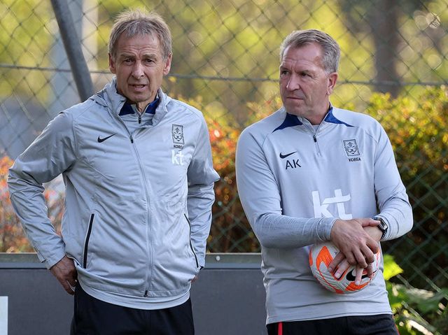 위르겐 클린스만 대한민국 축구대표팀 감독이 지난 9일 오후 경기 파주트레이닝센터(NFC)에서 훈련을 앞두고 안드레아스 쾨프케 코치와 대화를 나누고 있다. / 뉴스1