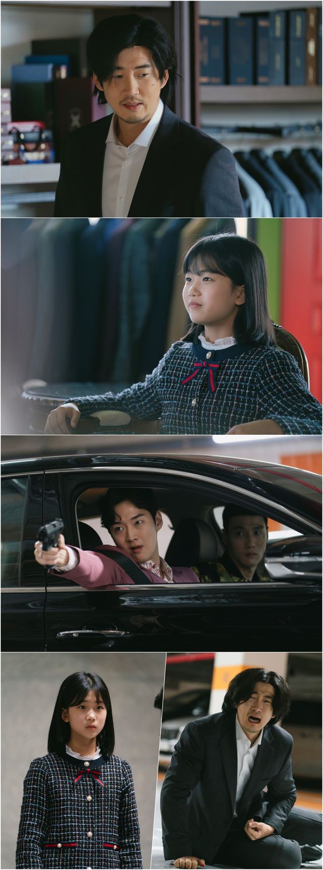 김명준이 변신한 이유는 유괴 자수를 결심한 이후, 마지막으로 수술에 들어갈 딸 희애(최은우 분)를 만나러 가기 위해서다. 앞선 예고편에서 “오늘 다 마무리해야지”라며 자신과 최로희 모두 원래 자리로 되돌아가기를 바란 김명준. 하지만 또 다른 사진에는 ‘빌런’ 제이든, 최호영(김동원 분)의 등장으로 단숨에 분위기가 반전된다. 누군가에게 총구를 겨눈 제이든과 주저앉아 오열하는 김명준, 겁에 질려 얼어붙은 최로희까지 일촉즉발의 위기 상황에 이목이 집중된다.