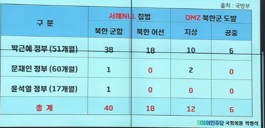 박병석 의원실이 공개한 북한의 서해NLL, DMZ 북한도발 현황(사진=국회방송)