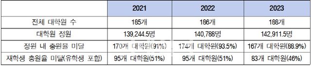 이는 학령인구 감소 여파가 일반대학을 넘어 대학원까지 영향을 미치고 있기 때문이다. 서 의원에 따르면 입학정원을 채우지 못한 일반대학원은 2021년 91%, 2022년 93.5%, 2023년 89%로 꾸준히 90% 안팎을 유지하고 있다.