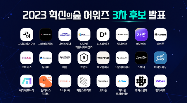 혁신의숲의 운영사인 마크앤컴퍼니(대표: 홍경표)가 11일 2023년 혁신의숲 어워즈 3차 후보 스타트업 24개사를 발표했다. 1차와 2차 후보 발표를 통해 총 55개 기업이 선정된 바 있으며, 이번 3차 후보 선정을 통해 후보 기업은 총 79개로 확대되었다.