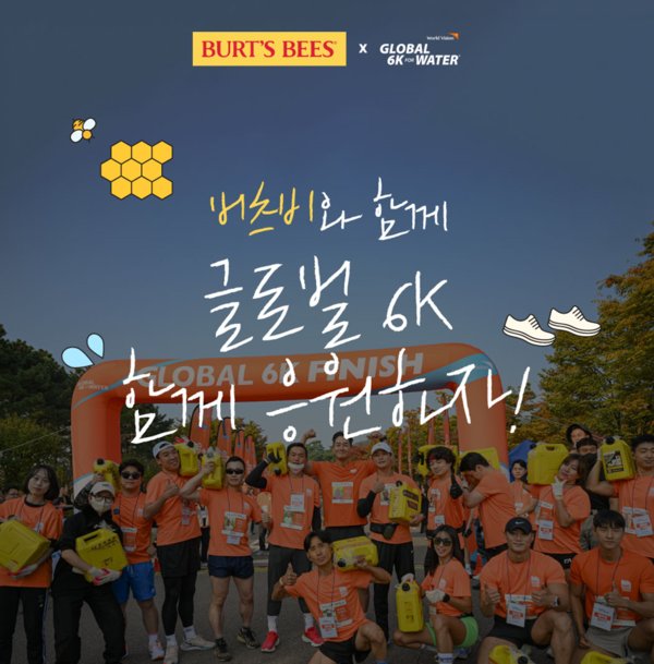 [한스경제=고예인 기자] 스킨케어 브랜드 버츠비가 오는 10월 14일 고양 일산 호수공원에서 국제구호개발 NGO 월드비전이 주최하는 ‘2023 글로벌 6K 포 워터 러닝(Global 6K for Water 러닝, 이하 G6K 러닝)’ 캠페인에 참여한다. G6K 러닝은 아프리카 아이들이 물을 긷기 위해 제리캔 보틀(물통)을 들고 매일 평균적으로 걷는 6km를 캠페인 참가자들이 직접 걷거나 달려 깨끗한 식수를 전달하는 글로벌 기부 캠페인이다.