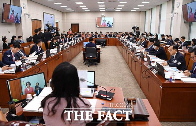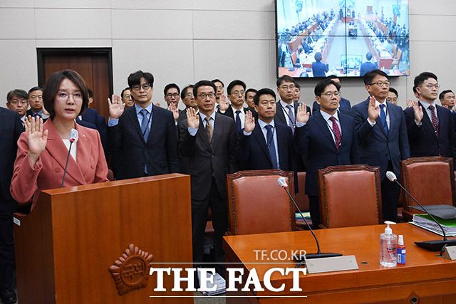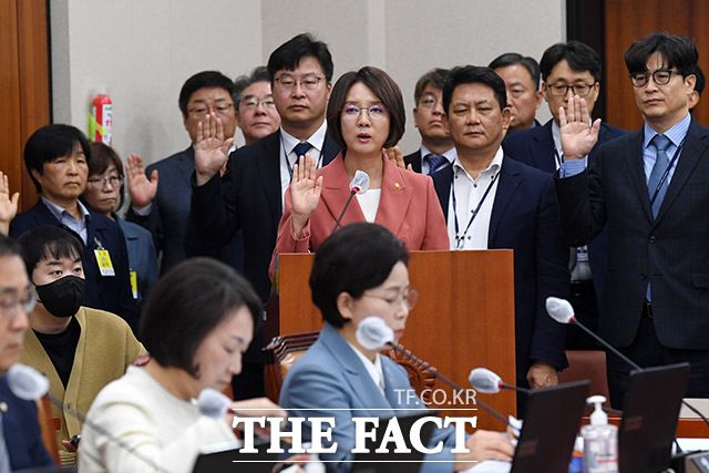 [더팩트ㅣ국회=남용희 기자] 이영 중소벤처기업부 장관과 관계자들이 12일 오전 서울 여의도 국회에서 열린 산업통상자원중소벤처기업위원회 국정감사에서 선서를 하고 있다.