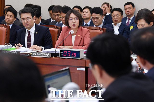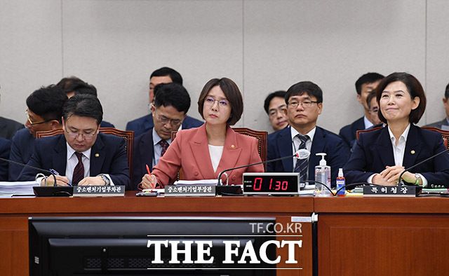 의원 질의에 답하는 이영 중소벤처기업부 장관(가운데).