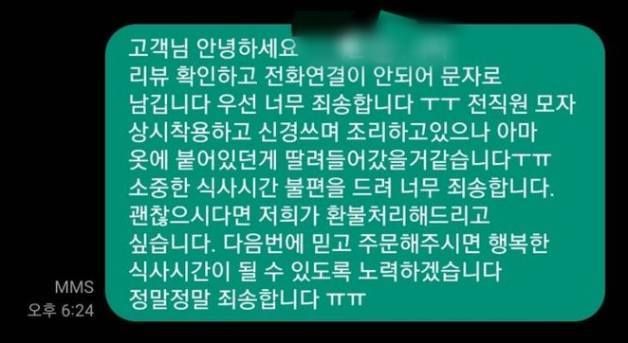 A씨는 문자에 "리뷰 확인하고 문자 드린다"며 "전 직원 모자 상시 착용하고 신경 쓰며 조리하고 있으나 옷에 붙어 있던 게 딸려 들어간 것 같다. 괜찮으시면 환불 처리해 드리고 싶다. 소중한 식사 시간에 불편하게 해 죄송하다"고 남겼다.