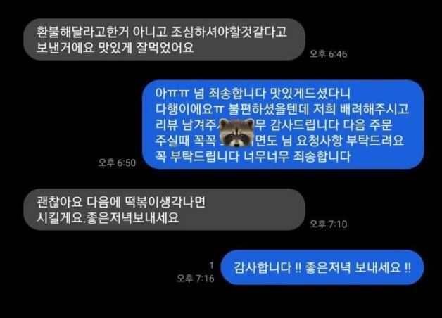 A씨의 거듭된 사과에 해당 손님은 끝까지 "괜찮다”며 “다음에 떡볶이 생각나면 시키겠다. 좋은 저녁 보내시라”는 말로 대화를 마무리했다.