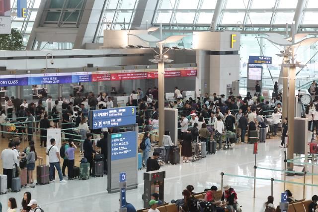 中秋长假期间,仁川机场内挤满了等待出游的游客。【图片提供 韩联社】