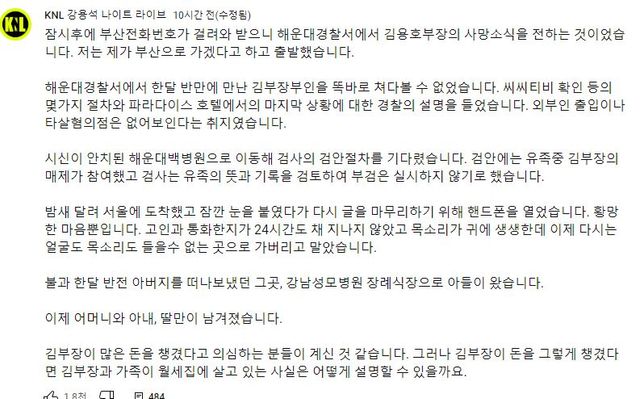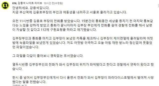 이어 "김 부장 부인에게 전화를 걸어 경찰에 전화해서 남편이 자살할 것 같다고 112에 구원요청을 하라고 이야기했습니다."라며 당시 상황을 전했다. 이어 유튜브 채널에 올라온 김용호의 마지막 음성녹음 파일과 관련하여서 "김 부장이 보냈던 카톡을 체크하니 김 부장이 케이엔엘에 올려달라며 어젯밤 녹음파일 보낸 게 있었습니다. 저도 어젯밤 귀국하고 오늘 아침 재판 받느라 정신없어 못 들었던 파일이었습니다."라며 올리게 된 배경을 설명했다.