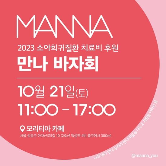 (엑스포츠뉴스 김유진 기자) 만나(MANNA)에서 주최하는 소아희귀질환 치료비 후원을 위한 '만나 바자회'가 개최된다.