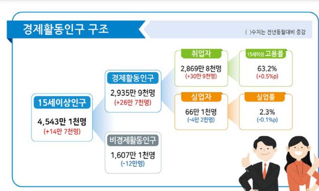 고용률은 63.2%, 실업률은 2.3%로 각각 9월 기준 역대 최고 및 최저치를 보이며 견조한 흐름을 이어갔다. 또 경제협력개발기구(OECD) 비교 기준인 15~64세 고용률 역시 69.6%로, 1989년 관련통계 작성 이래 9월 기준 가장 높은 수준이다. 15세 이상 고용률도 1982년 7월 월간통계 작성 이래 동월 기준 최고치다.