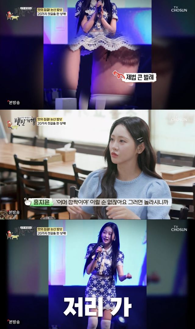 이에 홍지윤은 "경남 산청에서 열린 행사였다. 야외무대였고, 여름이었는데 벌레가 너무 많았다"면서 "꼽등이인지, 여치인지 모르겠는데 벌레가 다리에 딱 붙었다"고 회상했다.