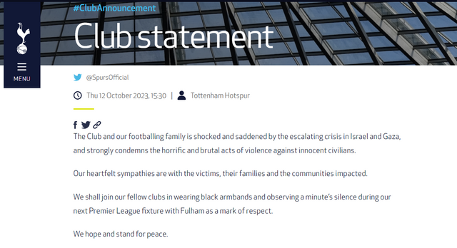 토트넘은 지난 12일 이스라엘-하마스 전쟁에 대해 "구단은 이스라엘과 가자지구에서 벌어지는 갈등에 충격과 슬픔을 받고 있다. 무고한 민간인에 대한 잔혹한 폭력행위는 근절돼야 한다"며 "구단은 피해자들과 유족, 그리고 폭력의 영향에 놓인 공동체 모두에게 유감을 표한다"는 성명문을 발표했다.