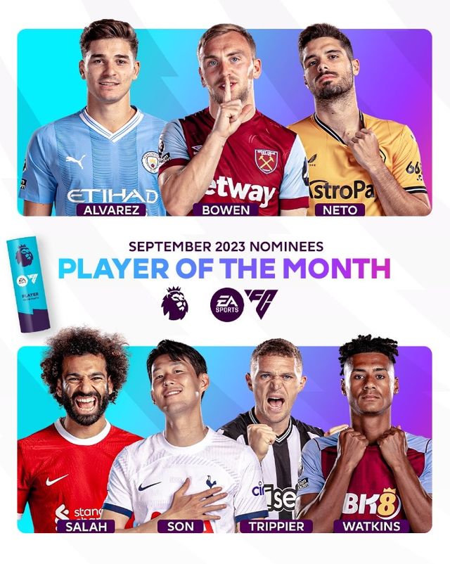 투표에서 손흥민은 훌리안 알바레스(4경기 2골 2도움·맨체스터 시티), 재러드 보언(4경기 3골·웨스트햄 유나이티드), 페드루 네투(4경기 1골3도움·울버햄프턴 원더러스), 모하메드 살라(4경기 2골2도움·리버풀), 키어런 트리피어(4경기 4도움·뉴캐슬 유나이티드), 올리 왓킨스(4경기 4골1도움·애스턴 빌라)와 경쟁을 펼치게 됐다.