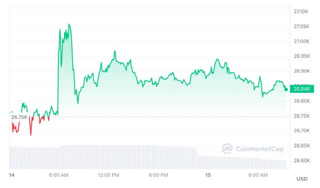 가상자산 시황중계 사이트 코인마켓캡에 따르면 이날(오전 9시 기준) 비트코인 시세는 전일 대비 소폭 하락한 2만6850달러를 기록했다.